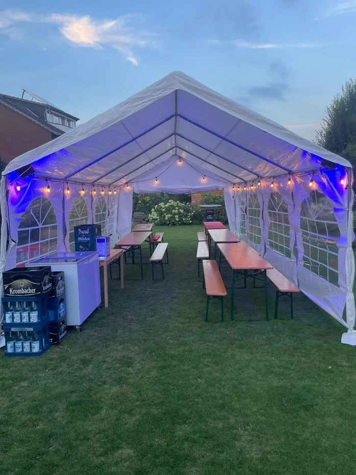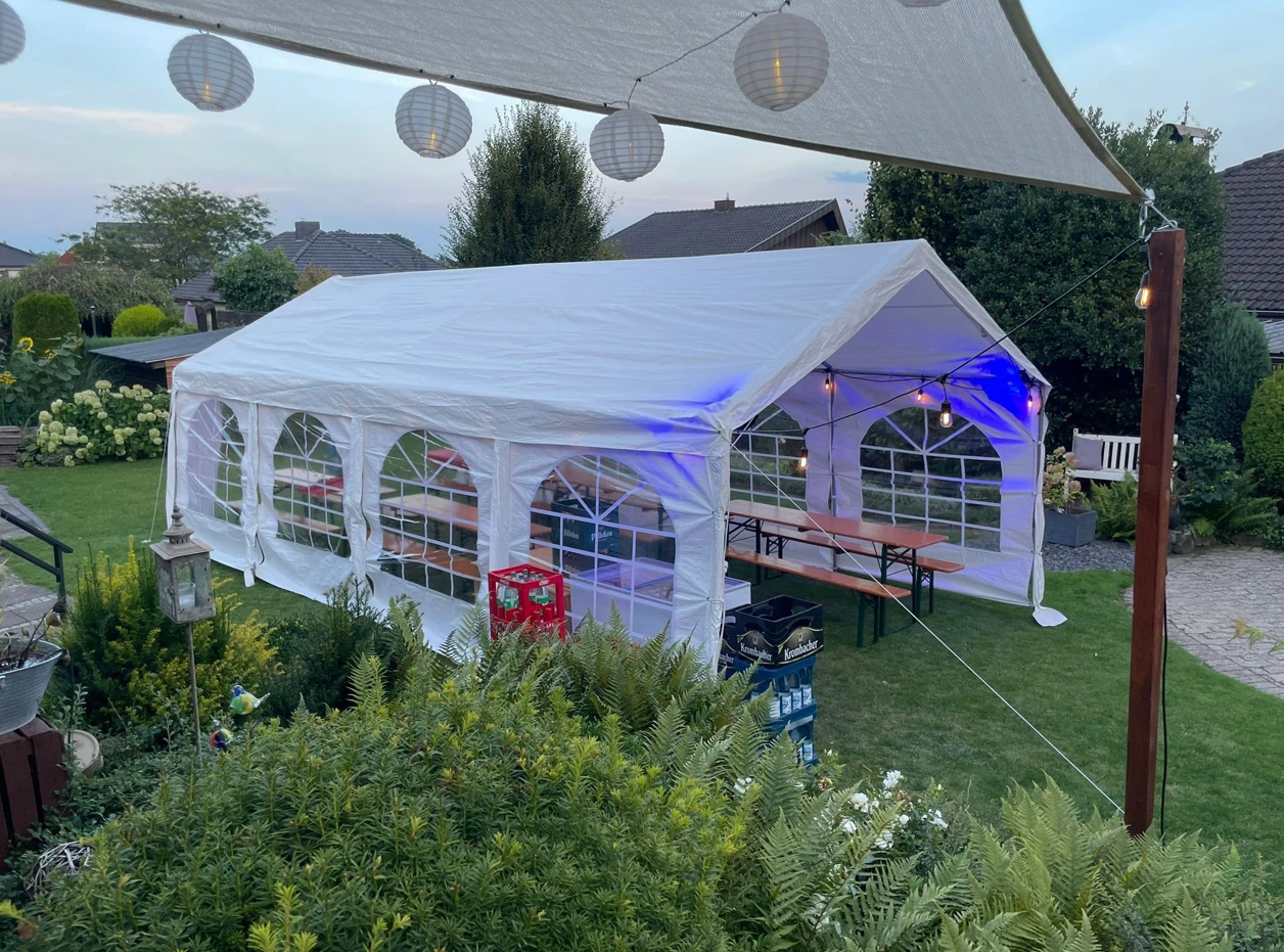 Das perfekte Partyzelt für Ihre Hochzeit, Gartenparty oder für ein geselliges Beisammensein. Egal ob Wind, Regen oder Sonne, mit unserem Partyzelt wird das Fest zum perfekten Erlebnis.